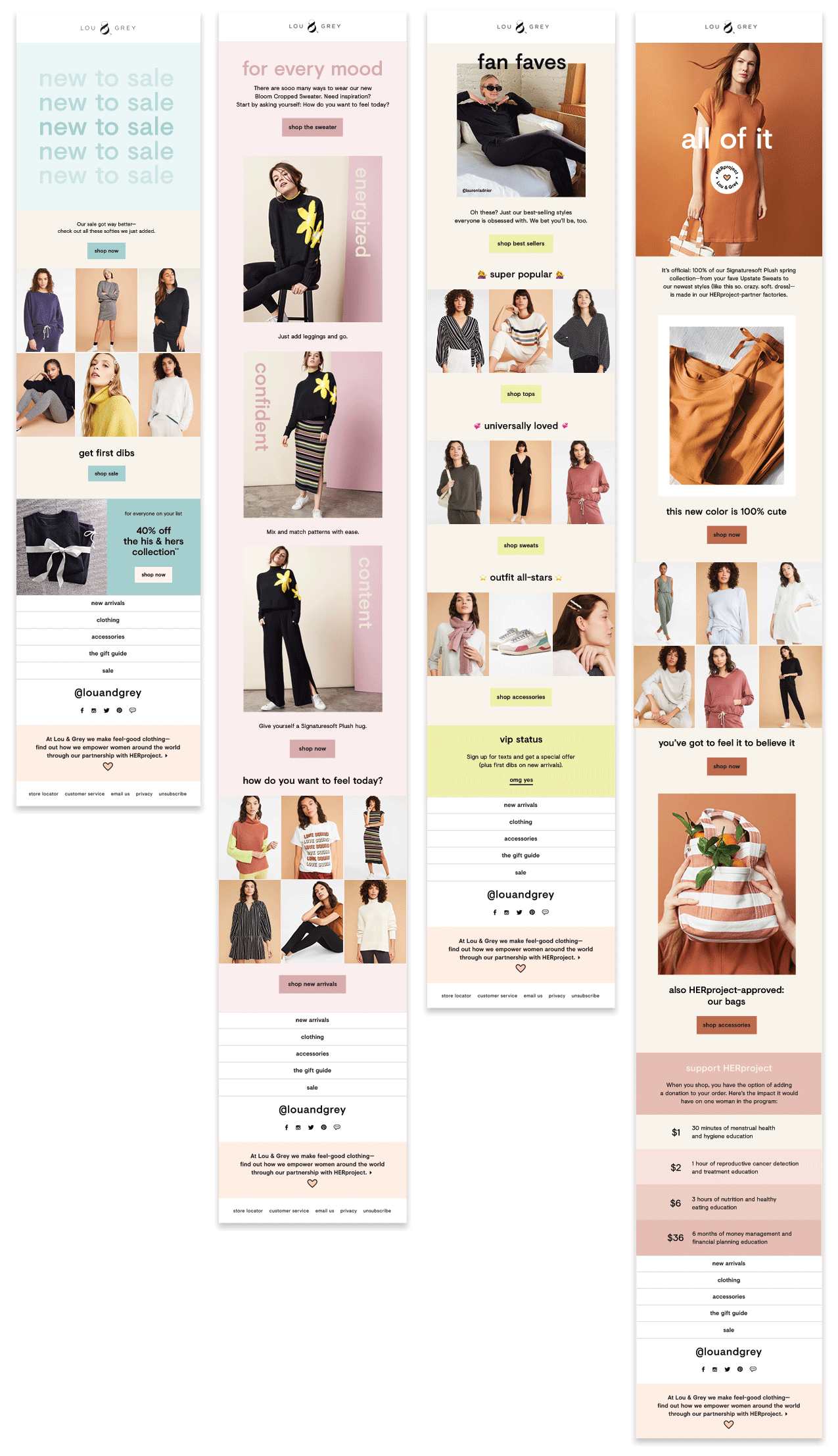 Projects shown below from top to bottom: paid social advertising, brand collateral, Instagram stories, poster design for 2019 Women’s March, email design